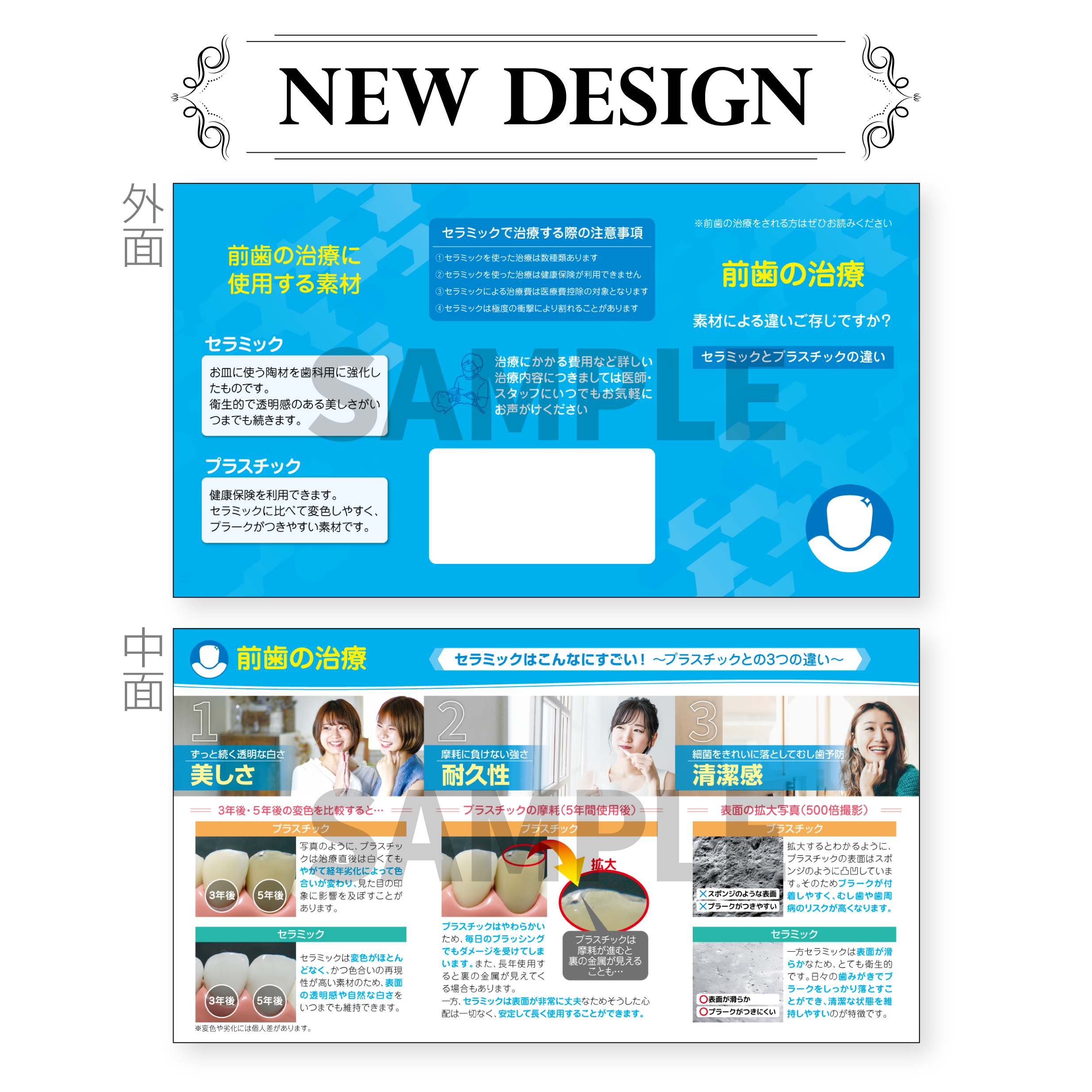 患者さんに前歯の治療に関して、セラミックとCR(プラスチック)との比較を説明するパンフレットです。