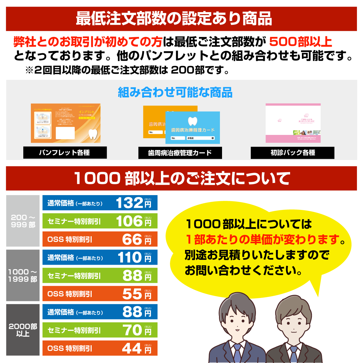 初回の最低ご注文部数は500部以上(他のパンフレットとの組み合わせも可能)です。