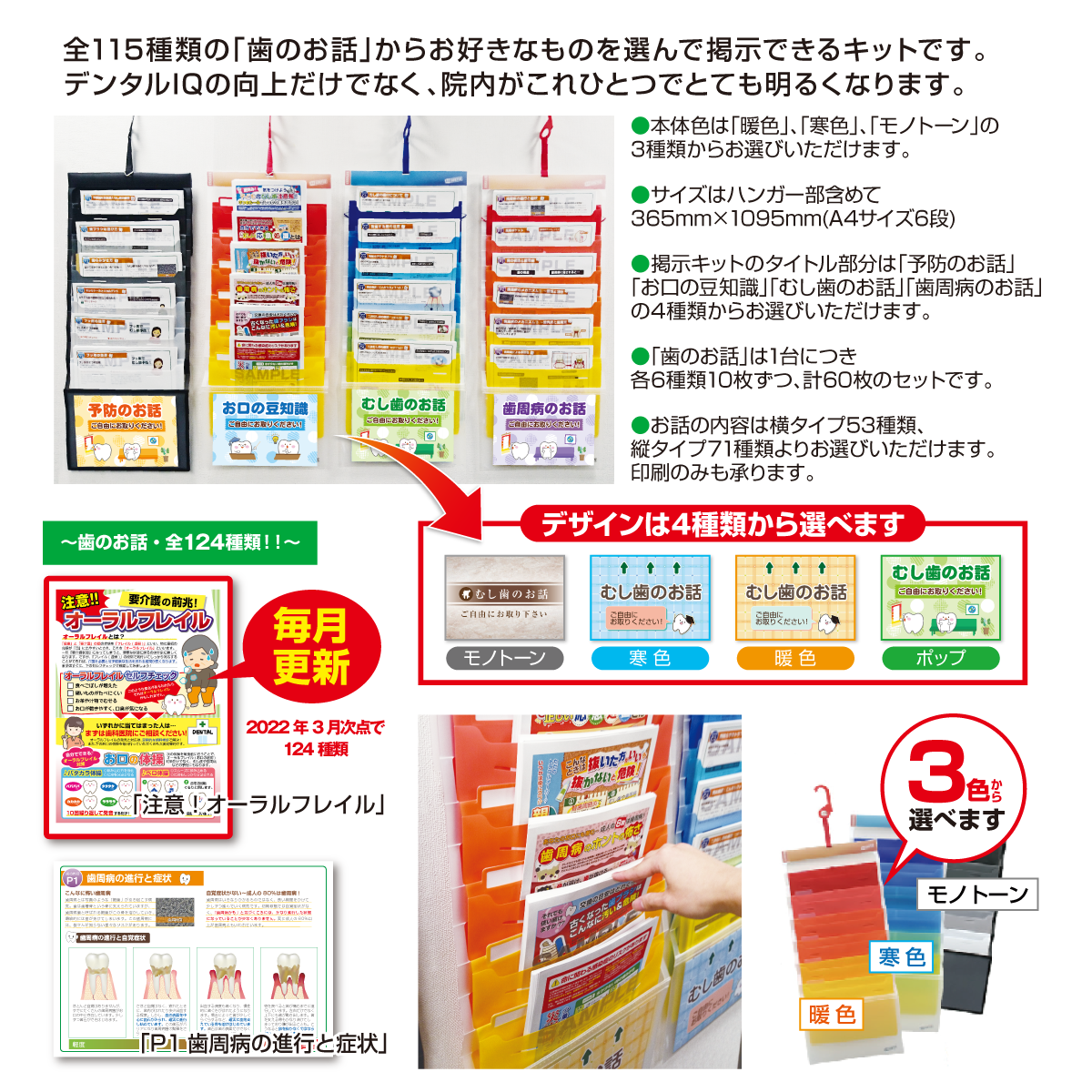待合室に掲示する「歯のお話」の展示キットです。こちらは3台セットの商品になります。