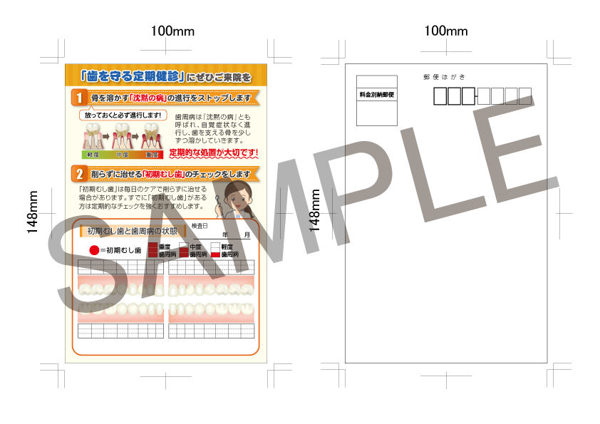 患者さんのリコール用のハガキです。内容は歯周病とむし歯になっており、患者さんの歯の状態を詳しく掲載することができます。プライバシー保護シール付きのため一般的なハガキと比較しても高い閲覧率を望めます。こちらの商品はオレンジとなります。