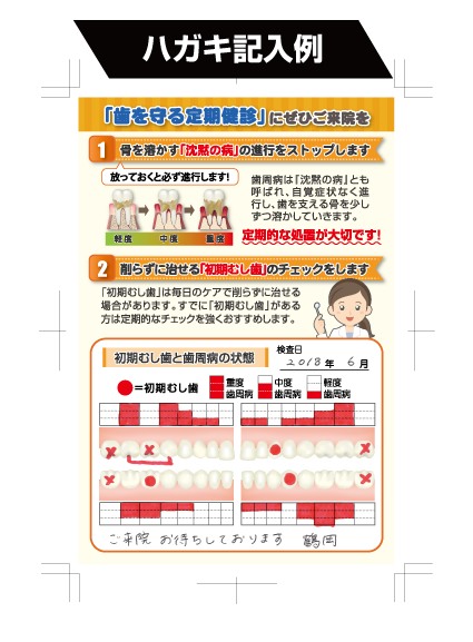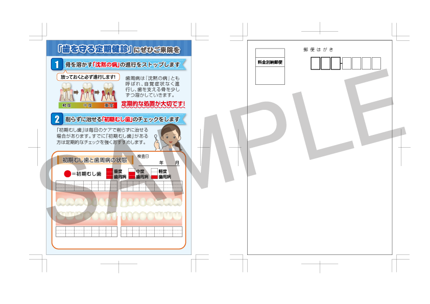 患者さんのリコール用のハガキです。内容は歯周病とむし歯になっており、患者さんの歯の状態を詳しく掲載することができます。プライバシー保護シール付きのため一般的なハガキと比較しても高い閲覧率を望めます。こちらの商品はブルーとなります。