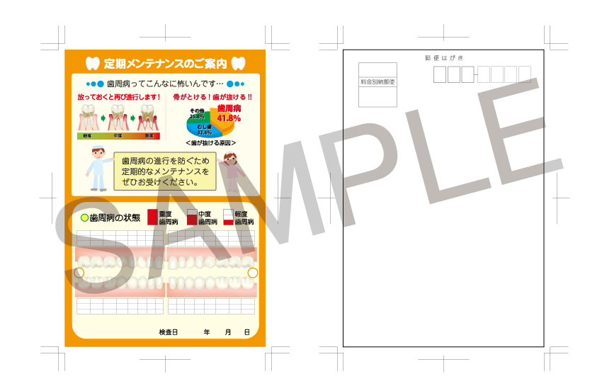 患者さんのリコール用のハガキです。内容は歯周病のみ、患者さんの歯の状態を詳しく掲載することができます。プライバシー保護シール付きのため一般的なハガキと比較しても高い閲覧率を望めます。こちらの商品はオレンジとなります。