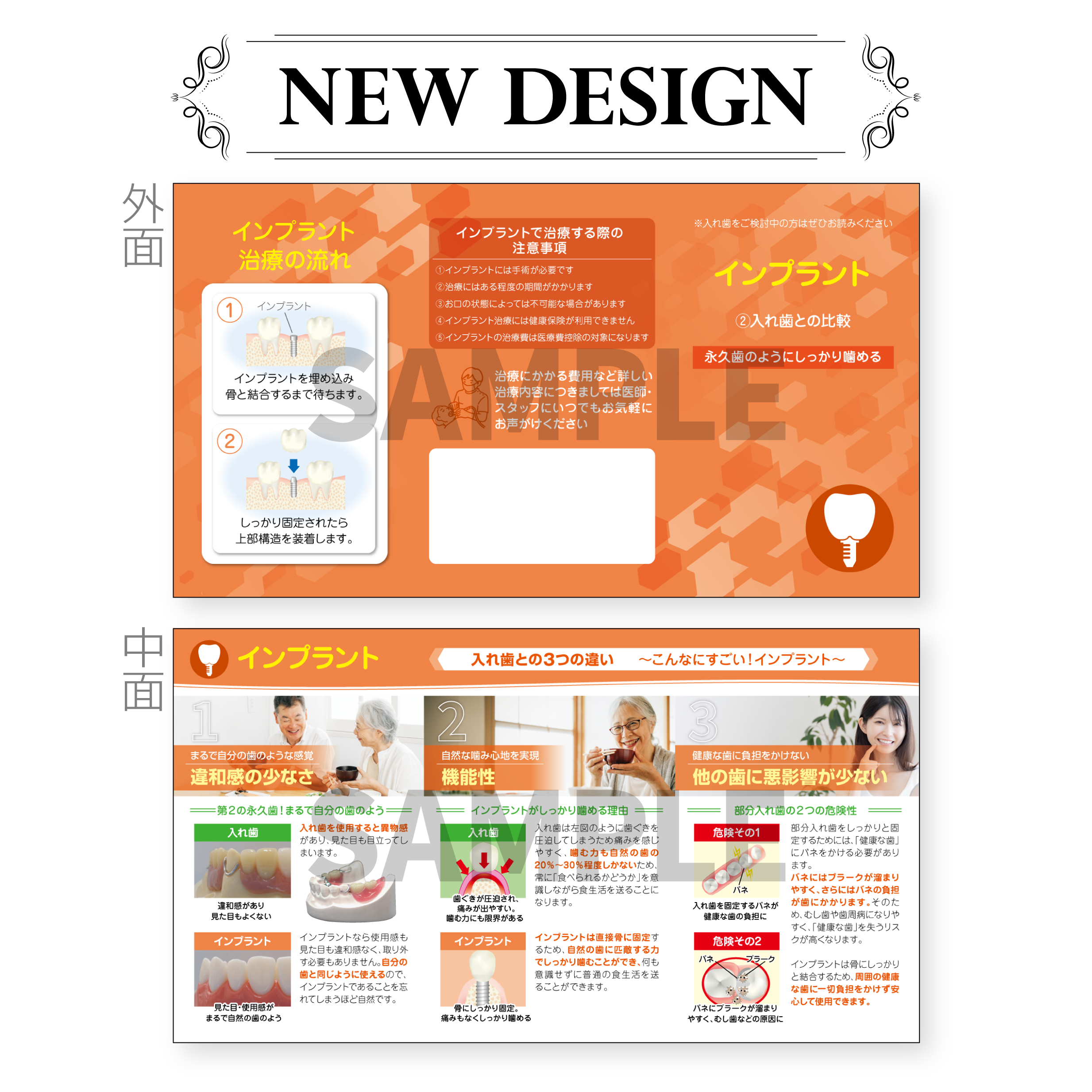 患者さんにインプラントのメリットを入れ歯との比較で説明するパンフレットです。