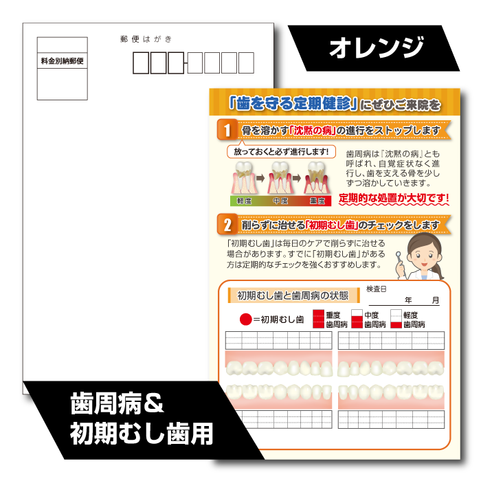 【リコールハガキ】歯周病+初期むし歯用(プライバシー保護シール付き)オレンジ