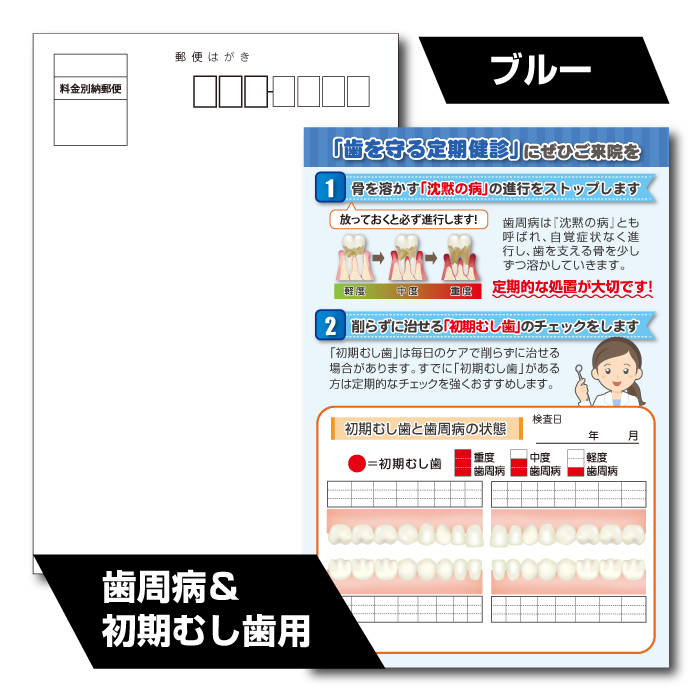 【リコールハガキ】歯周病+初期むし歯用(プライバシー保護シール付き)ブルー
