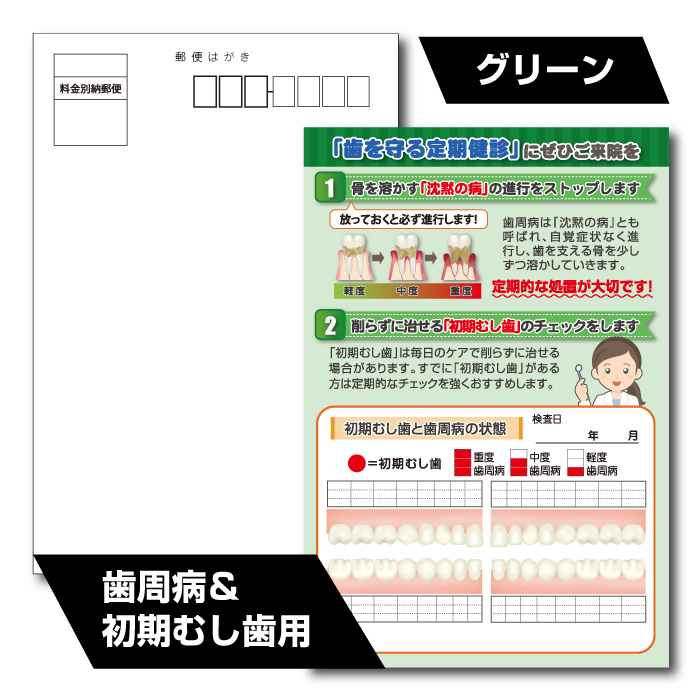 【リコールハガキ】歯周病+初期むし歯用(プライバシー保護シール付き)グリーン