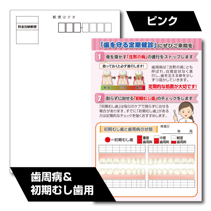 【リコールハガキ】歯周病+初期むし歯用(プライバシー保護シール付き)ピンク